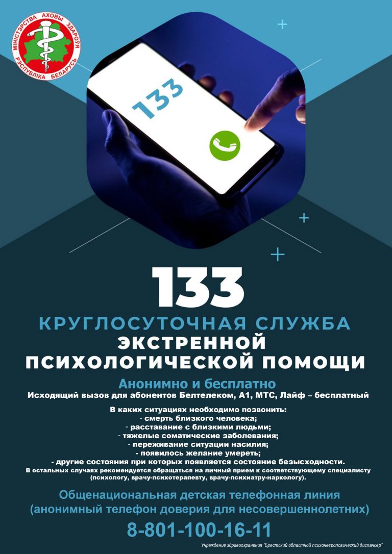В Республике Беларусь работает круглосуточная служба экстренной психологической помощи по номеру телефона — 133.